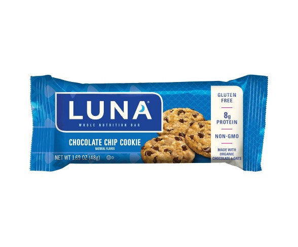 Description LUNA Bars are kitchen-crafted to help keep you nourished throughout your busy day and give you the energy you need to break through. Each bar is a delicious, nutritious, gluten-free snack that's perfect between meals.Contains: Almonds, soyMay Contain: Tree nuts, Milk, peanutsConsistency: ChewyProtein Grams per Serving: 8 gramsStore: In a Dry location at Room temperatureFeatures: No high fructose corn syrup, non-GMODietary Needs: Gluten freeForm: BarState of Readiness: Ready to eatPackage type: Multi-pack single servingsPrimary dietary ingredient: Plant-based proteinExterior container material: Paper or cardboardProtein type: Plant-based proteinNet weight: 10.14 ouncesPackage Quantity: 6Organic oats and chocolate chips will remind you of your favorite chocolate chip cookie. Best part? It's nutritious and delicious!MORE OF THE STUFF YOU WANT: Up to 8g protein and a low-glycemic index.LESS OF THE STUFF YOU DON'T: Gluten free, with no artificial flavors or high-fructose corn syrup.QUALITY INGREDIENTS: Plant-based, complete protein from soy provides essential amino acids. Carbohydrates come from organic oats and a blend of sugars with a low-glycemic index.CONVENIENCE: Wholesome, delicious on-the-go snack bars for energy whenever and wherever you need it. Estimated shipping dimensions: 4.8INCH X 2.4INCH X 5.3INCH DPCI : 071-20-1507 UPC : 722252385215 TCIN : 52110064 Estimated shippimg weight: 0.634POUND