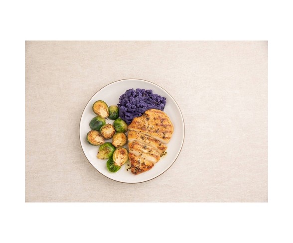 Description This chicken dinner is anything but boring! Juicy chicken is basted with a savory garlic herb butter and served with smashed purple potatoes and crispy Brussels sprouts. Full of flavor and made in less than 15 minutes, this quick and easy dinner is one you 'll make over and over again. Contains: MilkStore: In a Refrigerated location at RefrigeratedState of Readiness: Needs to be fully cookedPackage Quantity: 6Net weight: 23.1 ouncesPackage type: Individual item multi-servingPre-package preparation: Raw, grilledExterior container material: PlasticNo PreservativesMeal Prep in 15 minutes or lessContains Milk Estimated shipping dimensions: 9.1INCH X 7.6INCH X 16.1INCH DPCI : 268-12-0161 UPC : 852707007321 TCIN : 54440041 Estimated shippimg weight: 8.9POUND