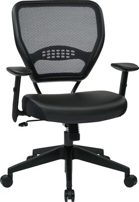 Description This Space Seating workdesk chair features an adjustable and ergonomic design Relax while working in this comfortable Space Seating workdesk chair. This eco-friendly chair features a professional air-grid back that keeps you cool when the workday heats up. The height-adjustable arms and seat allow you to tailor this chair's fit t o your frame, and the durable rolling casters glide across your workspace effortlessly and smoothly. This work desk chair has a durable foam seat pad covered with an attractive eco-leather upholstery. The high-quality plastic frame resists scuffs and sc ratches that commonly occur in high-volume environments. 42" H x 26.5" W x 25.25" D Eco-leather seat upholstery for long-lasting comfort Mesh back helps you stay cool and comfortable Greenguard indoor air quality certified for better breathing in the office ⚠ WARNING: This product can expose you to chemicals, including lead, which is known to the State of California to cause cancer and birth defects or other reproductive harm. For more information, go to www.P65Warnings.ca.gov/furniture. The Space Seating workdesk chair offers you the best in comfort and durability. Adjustable, for maximum comfort, this light-weight, but sturdy, office chair will cradle your body and make your day at the office a comfortable one. More comfort means more productivity for you and your office team. Comfort and StyleThe design of this mesh-backed workdesk chair allows for maximum air flow while seated, ensuring hours of cool comfort while at work. You deserve an adjustable workdesk chair that fits you. The adjustable arms and back allow you to customize your chair's dimensions to ensure the perfect fit for your body. The chair's castor wheels glide smoothly and effortlessly across any floor surface, making movement between multiple work areas quick and easy. Eco-Friendly DurabilityA workdesk chair with a conscience, the Space Seating chair is designed from Greenguard Indoor air quality materials, greatly reducing the amount of chemical and particle emissions given off from this product. Fewer emissions means better office air quality and a healthier work environment for you and your co-workers. The seat and back of the chair is covered with eco-friendly leather, offering a durable and easy to clean surface. The base is constructed of heavy-duty nylon for maximum stability. Specifications Chair Material : Leather Color Family : Black Office Chair Back Material : Mesh Height in Inches : 42 Depth in Inches : 25.25 Width in Inches : 26.5 Adjustable Height : Adjustable Arm Type : All Adjustable Adjustable Back Height : No Seat Glide : Yes Office Chair Base Material : Nylon Office Chair Caster Usage : Carpet Floor Office Chair Synchro Tilt : Yes Seat Material : Eco Leather Adjustable Tilt Angle : Yes Recline : No Recline Swivel : No Swivel Brand : Space Seating Customizable : No Weight : 40.00 lbs. per Each