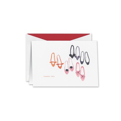 Description William Arthur Shoe Soiree Thank You Notes in white, feature a side and top fold William Arthur Shoe Soiree Thank You Notes are stamped with a touch of foil to provide an appealing look to your card. Available in a size of 3.75 x 5.12 inches, they feature a side and top fold. Color: White Size: 3.75 x 5.12 inch Type: Thank You Notes Paper Weight: 80 lbs. Design: Shoe Soiree Printing Process: Lithographed Orientation: Landscape Fold: Top Fold Specifications Product Color Family : White Pack Qty : 10 Note Card & Postcard Type : Thank You Notecards Paper Finish : Smooth True Color : White Height in Inches : 5.12 Width in Inches : 3.75 Printer Compatibility : Hand Written Envelopes : Envelopes Not Included Length in Inches : 3.75 Paper size Filter : 3.75 x 5.12 Preprinted Greeting : Blank Printing Paper Finish : Smooth Paper Weight in Pounds : 80 Stationery Theme : Formal Brand : William Arthur Customizable : No Weight : 4.00 lbs. per Box