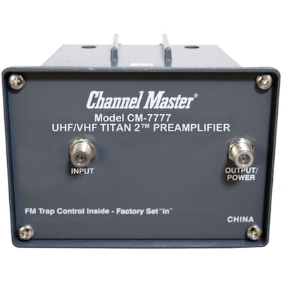 Description The Channel Master Titan 2 Preamplifier (High Gain) will amplify signals received by your antenna. This antenna amplifier is a high-gain, low-noise preamplifier used to allow weaker signals at the antenna to be amplified to a viewable strength, and is ideal for installations in which all broadcast towers are located at a distance of more than 80 miles. It is a two-part unit-an outdoor amplification unit which is mounted on the mast of your antenna system and an indoor unit which powers the outdoor amplification unit. The indoor unit is stationed indoors and connects to the outdoor unit via coaxial cable. The Titan 2 High-Gain Preamplifier is recommended for professional installers only. Improves signal quality Decreases pixelation May increase number of channels Ultralow noise Selectable FM signal passthrough Heavy-duty rating for outdoor use Mast mounted for close proximity to antenna 90-day limited warranty 30db gain Specifications Number of Channels : 1 Warranty Information : 90 Day Audio Input : 2-Way Audio Audio Outputs : External line output Compatible with Bluetooth : Not Bluetooth Compatible OHMs : 75 Receiver & Amplifier Type : Amplifier Power-Wattage : 100 Brand : Channel Master Customizable : No Weight : 1.60 lbs. per Each