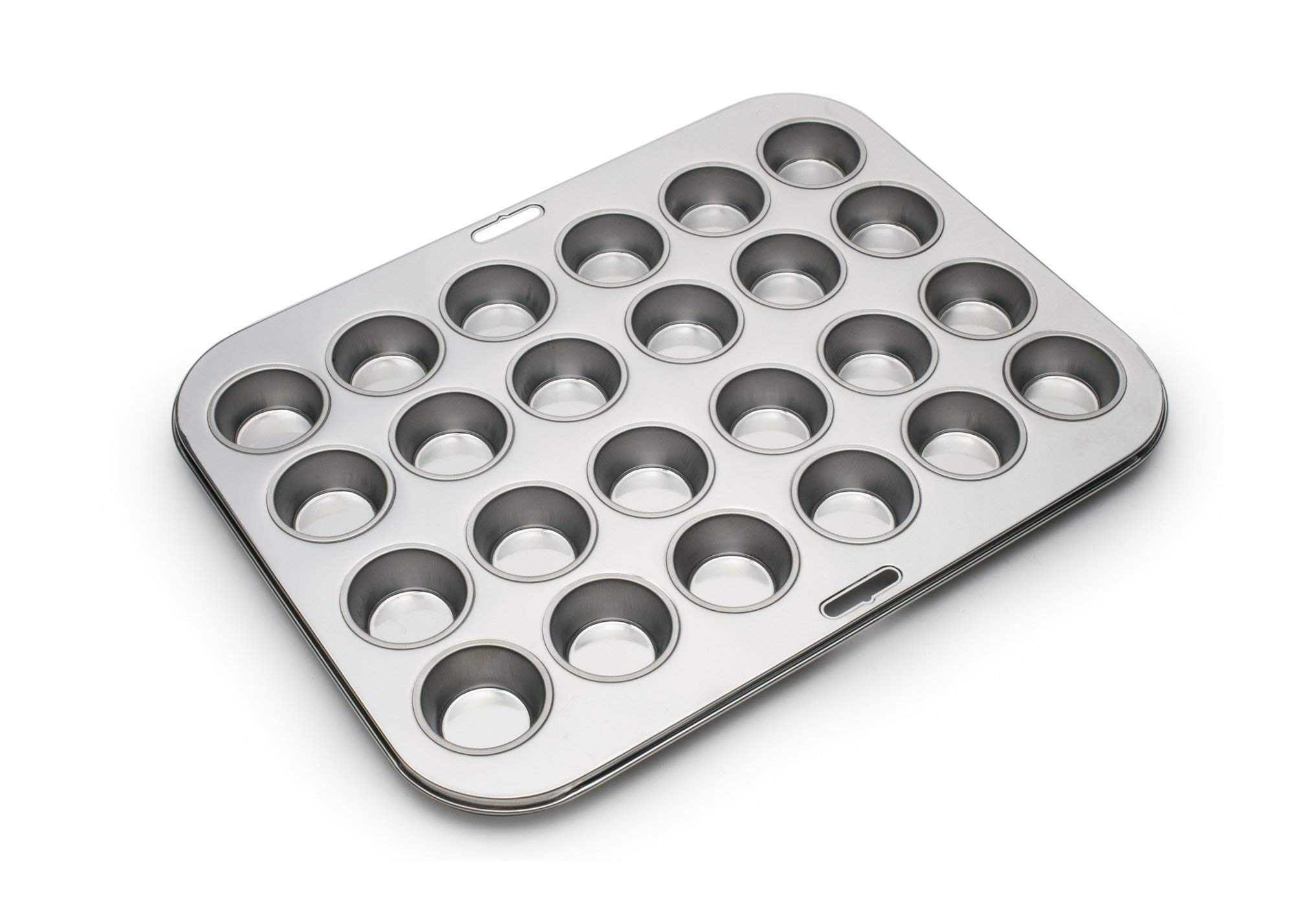 The Fox Run 4866 Mini Muffin Pan is a premium stainless steel bakeware featuring 24 mini molds designed for bite-sized muffins and cupcakes. Its stain, scratch, and rust resistant surface withstands temperatures up to 536°F without warping or corroding. Non-reactive and dishwasher safe, this pan ensures even heat distribution for perfectly browned treats and long-lasting durability, making it a must-have for passionate home bakers.
