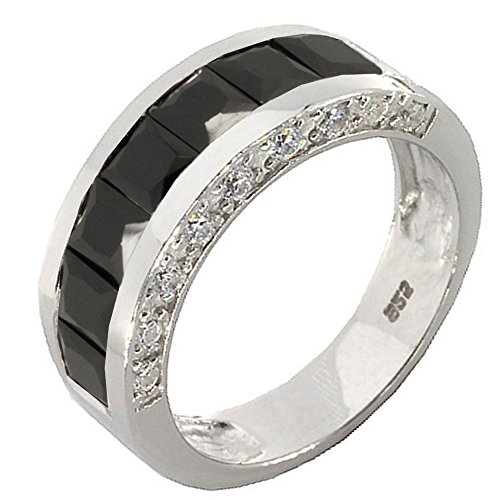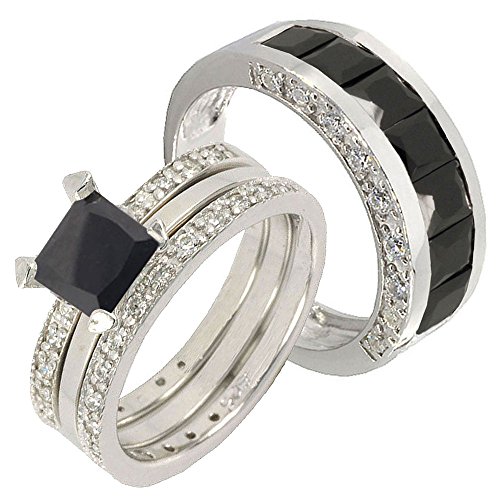 His and Her's wedding ring set, with sterling silver 925 women set ring and men's band combine together. All jewelry need good care no matter sterling silver, titanium or tungsten jewelry, our sterling silver ring was rhodium plated, you cannot use any chemical to wash it even wash hand, do not use any lotion or perfume apply on the ring surface it will effect the rhodium plated, it may make the ring tarnish due to outside chemical effecting the coating. all jewelry need to clean after use.