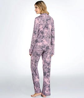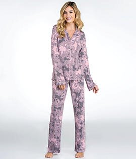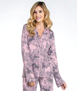 A lace print brings a feminine feel to this PJ LUXE pajama set. The top has a buttoned placket and a single pocket. Long sleeves. A drawstring cinches the wide-leg pants.
