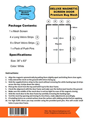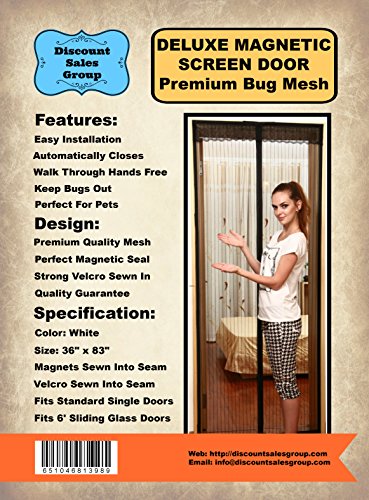 NEW DESIGN PREMIUM MAGNETIC SCREEN DOOR Don't settle for alternative as seen on TV products with outdated designs - Made from deluxe premium mesh - Magnets are hidden inside the seam - Velcro is sewn into the mesh Premium Quality Mesh See and feel the difference of the high quality polyester used in Instant Bug Mesh, a stronger more durable mesh which feels soft, is machine washable and keeps more bugs out. Competing mesh products generally use lightweight polyester with seams that are heat sealed rather than sewn, to save on manufacturing costs. Perfect Gap Free Seal Using a combination of long magnet strips and strong magnet blocks, Deluxe Magnetic Screen Door magnets are sewn into the seam providing a perfect seal from top to bottom. Magnets from competing mesh products are fastened in plastic clips leaving gaps where bugs will sneak in. With regular use the plastic clips can come loose and fall off. Velcro system Instant Bug Mesh has four 8 inch Velcro strip sewn into the mesh across the top and four 4 inch Velcro strips sewn down each side. Additionally you can use the provide push pins for an installation strong enough to handle years of heavy household traffic. Competing mesh products ship with pieces of double sided sticky tape which is expected to stick to both the mesh and the door frame and simply will not last with regular use. Installation is a breeze Installs in seconds - No tools required - Strong Velcro - Optional push pins provided Deluxe Magnetic Door Screen comes with a full 12 month replacement guarantee for manufacturing faults! - Flying off the shelves! Click the Add To Cart button now and let the fresh breeze in!