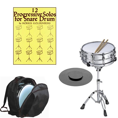 Package includes Student Snare Drum Kit w/Stand, Backpack Carry Bag, Drum Practice Pad & Sticks & 12 Progressive Solos for Snare Drum Book. Snare Drum Kit- The snare features 10 lugs, drum sticks, a double braced stand, back pack style zippered bag which is lightweight and convenient for students and Gladstone Style Drum Practice Pad which lays on snare drum to muffle the sound. Twelve Progressive Solos for Snare Drum- Easy to difficult arrangements of snare drum solos that have long been standard items on contest lists. Excellent practice material.