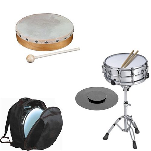 Package includes Student Snare Drum Kit w/Stand, Backpack Carry Bag, Drum Practice Pad & Sticks + Bonus 8" Hand Drum. Snare Drum Kit- The snare features 10 lugs, drum sticks, a double braced stand, back pack style zippered bag which is lightweight and convenient for students and Gladstone Style Drum Practice Pad which lays on snare drum to muffle the sound. 8" Hand Drum-World Percussion 8In. Wood Hand Drum W/ Head.