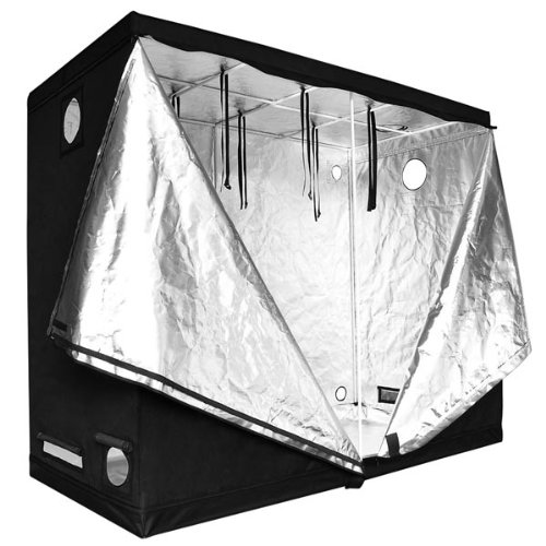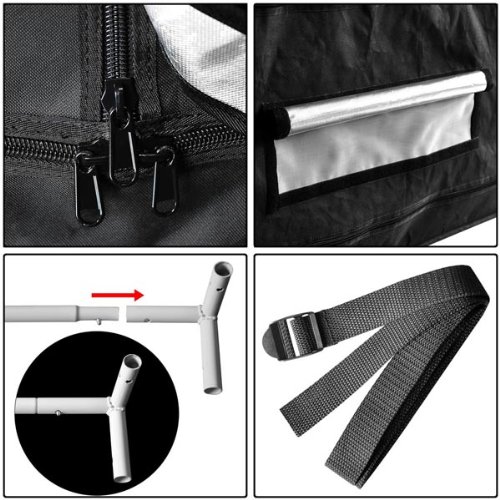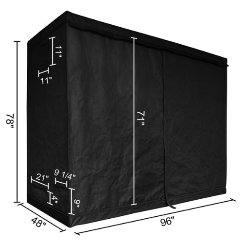 Features Size: 96"(L)x48"(W)x78"(H) Exterior Material: heavy duty 600D oxford cloth Interior Material: 100% highly reflective waterproof diamond mylar Frame: white paint coated metal rods Connector Material: sturdy metal Each Rod Capacity: 88 lbs (40 Kg) Overall Capacity: 352 lbs (160 Kg) 6in/8in double vents for regulating the flow of air more effective Rectangle vents with mesh for better ventilation Built-in a Large Door for setting up lighting system and moving plants in or out easily. Multiple vents for 4in, 6in or 8in fan and filter output Suitable for use with 400W,600W and 1000W grow lights and the larger T5 lights for propagation. 6 nylon belts for hanging the grow light Extra removable waterproof floor tray with belts for more protection Quality Improvement: Interior material use Diamond mylar enhance the reflective effect. Rectangle vents use high density screen to prevent mosquito fly inside. *Please kindly note that the grow light system is not included. Package Contents Reflective Growing Tent Cover set Metal Frame Assembly Instruction Removable Water-proof Floor Tray 6 Nylon Belts