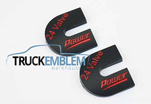 Brand new custom Dodge Cummins Diesel 24 Valve Diesel Emblems for the Cummins Diesel Truck that are painted matte black and have a gloss red lettering to give your truck that custom look while maintaining the factory appearance! Both of these emblems are brand new never used with adhesive tape on the back so you can just peel and apply them onto any smooth surface on your truck. These are designed for the Dodge Cummins Diesel trucks, however you can apply them to any year or model vehicle that has a Cummins 24 valve motor in it. Give your truck that unique look that sets it aside from the rest!