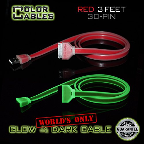 COLOR CABLES: Apple 30 Pin - Charge and Sync Cable - 3 FEET Blue, Red, Orange, Green, Purple, Grey & Pink for Apple iPhone 4, 4s, 3gs - iPod Touch 1, 2 ,3, 4 - iPad 1, 2, 3, 4 - iPod Nano - Old Generation COLOR CABLES GLOW IN THE DARK PREMIUM CHARGE & SYNC DATA CABLE Apple 30 Pin Dock Connector Cable to USB A Male Cable. GLOW IN THE DARK Infused with photo-luminescence for a bright renewable glow. The Cables absorb energy from the sun or an artificial light source and re-emit the energy as visible light in the form of a glow EXTRA STRONG & TOUGH Reinforced from tail to tip and with a soft gummy texture, made to last (LIFETIME WARRANTY). 100% Satisfaction Guaranteed EASY TO CONNECT Compact connector, features a thumb/finger groove for fast easy connection TANGLE PROOF A flat design means they will never tangle MULTIPLE COLORS Blue, Red, Orange, Green, Purple, Grey & Pink MULTIPLE SIZES 3 FEET & 6 FEET DIFFERENT CONNECTORS Compact Apple Lightning (8 Pin) - Micro USB - Apple 30 Pin HOW TO GET YOUR CABLE TO GLOW IN THE DARK: * - First you need to charge up the Photo-Luminescent feature. * - Place your cable under a table lamp or in direct sunlight for 1 hour or more. * - One or two hours of light absorption will result in 2 -7 hours of glow. * - Duration and brightness of glow is directly related to the power of the light source and the amount of time the cable is exposed to light. * - Best results are achieved using a table lamp. Direct Sunlight is also great. Sync Different...!
