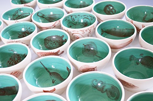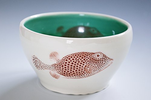 Handmade wheel thrown porcelain pottery. White on the outside and dark teal blue on the inside, with a spotted trunk fish design from an 1800's scientific drawing. Small bowl holds about 6-8 oz, about 4x2.5 inches. Food safe, microwave safe, and dishwasher safe. These bowls are the perfect size for just about everything: ice cream, snacks, side sauces, yogurt, macha tea, nuts, tea bags, jewelry, rings, you name it :) The photo is an example of the bowl you will receive. Because it is handmade, each bowl will be slightly a different size and the graphic might be in slightly a different orientation. It will look very much like the photo though.