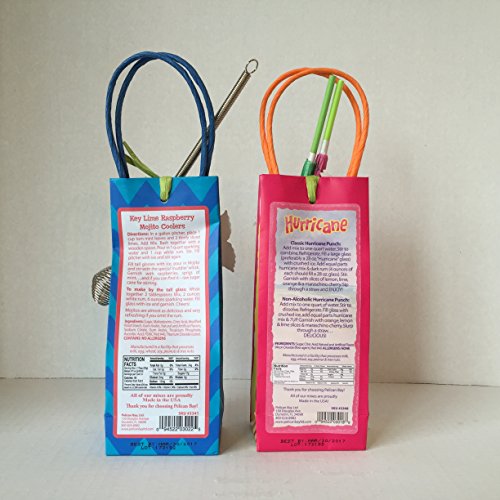 PELICAN BAY KEY LIME RASPBERRY MOJITO COOLER MIX: Enough Mix to make a big pitcher of delicious Raspberry Mojitos, with or without rum. Refreshingly delicious mint and key lime to combine with sparkling water and rum for instant good times. Packed in a colorful tote and an attached whisk wire with ribbon is the perfect finishing touch!........ PELICAN BAY HURRICANE MIX: All The Thrills Of A Hurricane Captured In A Tropical, Fruity Punch. Escape the everyday - take your taste buds on a tropical vacation. Just add sparkling water and fly away to happy land where life is good. Original, all natural, fruity flavor with the zest of citrus and thirst quenching sparkle. Delicious virgin - or elevate the experience to cocktail nirvana by adding dark rum. Delicious With Or Without Alcohol........ BONUS FREE small Patriotic American Flag