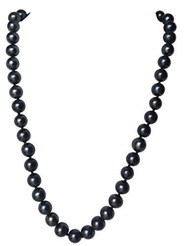 This gorgeous black (with natural shades) necklace is strung together with 8-9mm black cultured freshwater pearls. Great luster, smooth surface, round to the eye. 30" in length. Comes in a luxuary jewelry box.