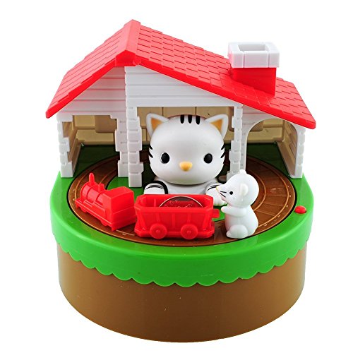- Put coin on the cart, long press the red button, the mouse will push the the car around the track with music, and the cat is trying to catch the mouse, very interesting and happy for your children to save money.