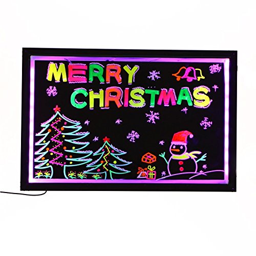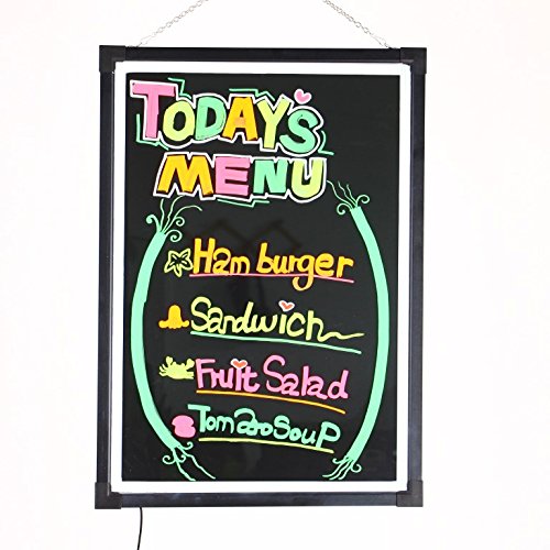 This FORION LED message board features 7 colors and various flashing modes and patterns that can help you show off your restaurant daily specials, promotions, special events, or even act as a fun toy for you and your family. You can write or draw anything with special fluorescent markers and easily wipe them off with a dry or wet cloth. Features CE and RoHS certified Light source: 7 color circle and single color adjusted Dimensions: 15'' x 23'' / 18'' x 27'' /24'' x 32'' Frame material: aluminum construction, imported acrylic panel and black organic baseboard LED lifespan: 100,000 hours Working temperature: -40~60 Degree C Working humidity: 0%RH Power: AC110-240V, DC12V-1A Easy to Use: ready to use right out of the box; simply plug in, then write on and wipe off - Also lightweight and easy to carry around and set up. Versatile Positioning: with the steel chain, you may position the board in two directions - either horizontally or vertically. Package Contents 1x 15"x23"/ 18'' x 27'' /24'' x 32'' LED Board 1x hanging chain 1x power adapter 1x wiping cloth 1x USB converter 1x power cord Note Avoid moisture, rain, snow, or prolonged exposure to sunlight.
