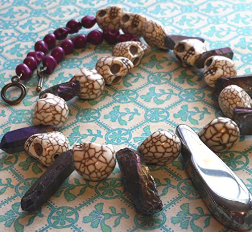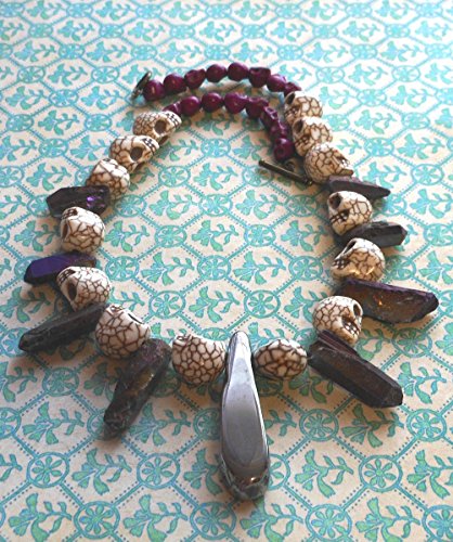 Shiny Rebel handcrafted necklace is made of interspersed carved howlite skulls with lots of crackling and detail. the focal piece is a shiny titanium silver plated chunky agate drop and rainbow titanium rough cut quartz sticks. towards the clasp are fuschia skulls for a pop of color. approximately 19 inches long. silver metal toggle clasp.