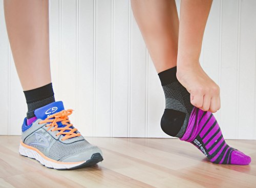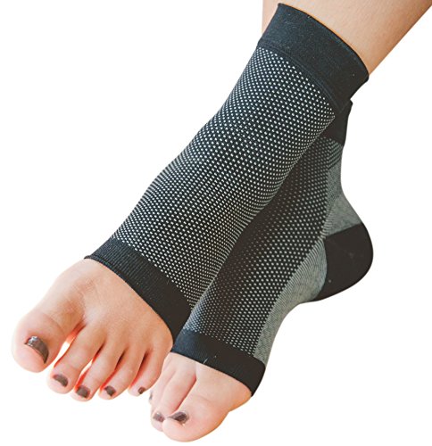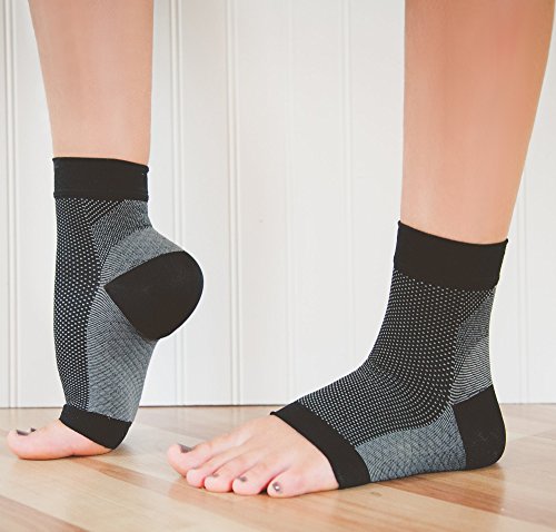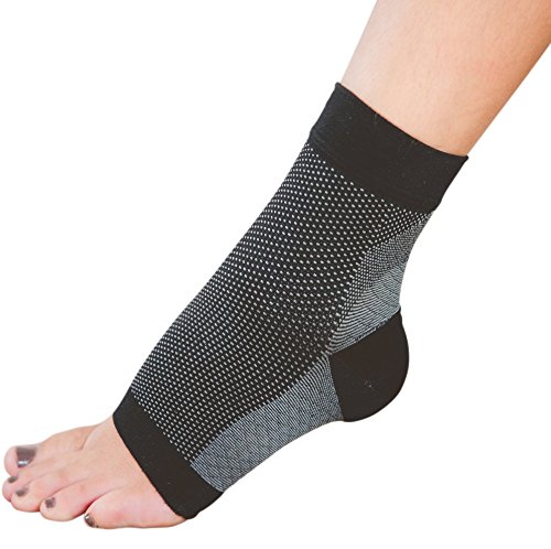 What Sets Us Apart From Our Competition? Style: Most of our competitors stitch a logo into the sleeve. Who wants to advertise an obscure brand? We don't, so we left it off. Strength of Stitching: The sole has been reinforced to provide extra cushion, and limit the effects of wear and tear. Premium Quality: We evaluated many of our competitors' products in the R&D process. In many cases, the stitching frayed after minimal use. Or, the ankle cuff stretches out and slides down. Our sleeves maintain form, even after repeated machine washes.How Will They Benefit You? - Graduated compression enhances blood circulation. Helpful for travelers or those with edema- Provides stability to your plantar fascia, so you can get back to your active lifestyle or job- Provides plantar fasciitis relief, especially that painful first step out of bed- Provides support for a stress fracture, or other heel/Achilles/ankle ailments- Helps reduce lactic acid build up so your muscle recovery times is greatly reduced- Wickable fabric keeps your skin dryWho Might Benefit? - Any sufferer of plantar fasciitis, edema, stress fracture, heel pain- Long distance air travelers- Workers with long periods of standing, strain SizingTo determine the optimal size, it's recommended to measure around the ankle (see Product Images). Small: 18.5-22.0 cmMedium: 22.0-25.0 cmLarge: 25.0-28.0 cmFoot anatomy is complex, and "size" can vary in many different ways (e.g. height, arch, width). Our sizing guidelines cover the majority of cases, but if you determine the product doesn't fit properly; please contact us directly. We'll arrange for a free replacement in a different size.