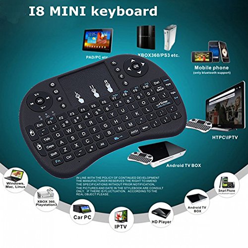 Your remote control can be changed, this mini keyboard will help you operate the TV better.Features: 2.4GHz wireless Keyboard with Touchpad. Touchpad DPI adjustable functions. Built-in high sensitive smart touchpad with 360-degree flip design. Mini QWERTY keyboard with multimedia control keys and PC gaming control keys. Auto sleep and auto wake mode. Innovative shape, protable, elegant. The Ergonomically handheld design is easy to carry and operate. Perfect for PC, Pad, Andriod TV Box, Google TV Box, Xbox360, PS3, HTPC/IPTV, etc. Specification: Operating range: 15 meters(MAX), without signal disturbance and no direction limit. Frequency range: 2.403GHZ ~ 2.480GHZ Operational voltage: 3.3V Modulation: GFSK Channel: 78channels TX Power: less than +5dBm Transmission rate: 1M bit/sec Frequency tolerance: +/-30ppm Power consumption: 55mA(on), 1mA(sleep) Color: White + Black Battery: Lithium battery included. Item size: 15 * 10 * 2cm Item weight: 107g Package size: 17 * 14.5 * 3.5cm Package weight: 175g Package contents: 1 x Mini wireless keyboard/Air Mouse, with English keys. 1 x Wireless receiver 1 x Rechargable Lithium battery 1 x USB cable