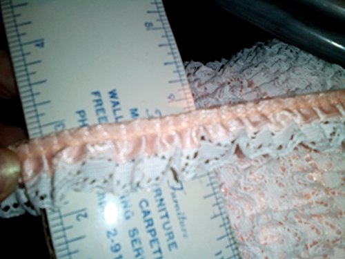 New, in sealed bag. Lace Ruffle 3/8" Satin on 1/2" lace Peach/White 4 Yards.