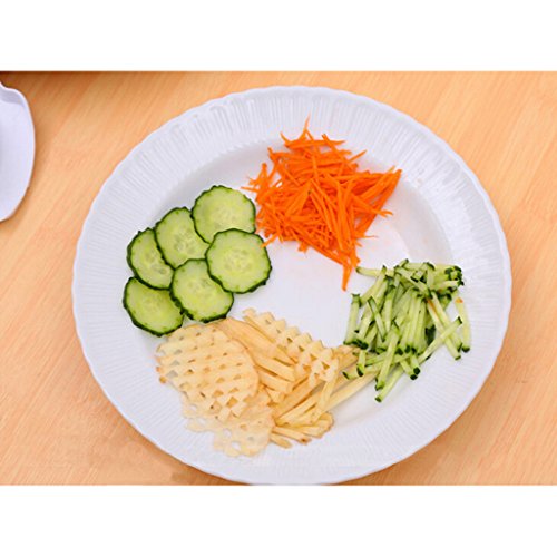Creative Multi-Function Kitchen Tools - Hand-held Mandoline Slicer Set 5 in 1 - Perfect for Slicing and Dicing a Wide Variety of Fruits and Vegetables! Package includes (1)an ABS plastic frame, (2)a safety holder, (3)and 5 different blade inserts. 1 X Detachable mandoline slicer, it is a tough ABS plastic frame. 1 X Safety hat offering protection, cutting hat to secure food and offer protection whilst cutting. 1 X 2mm (0.079in) Julienne blades. 1 X 3mm (0.118in) Julienne blades. 1 X Straight slicer. Perfect for slicing fresh cucumber or thinly cut potato chips! 1 X Grate blade. Notice! Need the Beautiful Grate flower Need to rotated the food 90 degrees,then cut again,repeatedly everytime. 1 X Grind grater. Ideal for grating garlic, ginger or even chocolate! Caution: * Sharp blades! Keep away from children! * Use, wash and store with care. * Use the food holder for safety. * Keep planing away from fire. * After use please cleaning asap! Avoid metal get rusty. * Due to Ingredients have deep color, the planing color maybe will change. You could use oil to clean. It not effect to use. * Cleaning with sponge, cleaning agent also could use dishwasher.