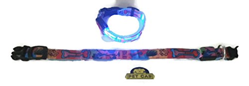 More than one million dogs are killed by cars every year. Whether you walk your beloved dog at or after dusk or before dawn, the two of you will be vividly visible to traffic with one of Pet Cab's amazing glow and LED flashing lights nylon dog collar. This LED light-up dog collar is stylish, durable, light-weight, flexible, easy to store, and fun to use. It has a polymer core with blue lights surrounded by strong webbing. But more importantly it can save your dog's life. Size dimensions of each collar: Small: Width 3/4" and adjusts to fit neck sizes - 13.7" to 16.9" Medium: Width 3/4" and adjusts to fit neck sizes - 15.7" to 18.9" Large: Width 1" and adjusts to fit neck sizes - 17.7" to 20.5" X-Large: Width 1" and adjusts to fit neck sizes - 20.5" to 23.6" Get one for each of your dogs today. A great gift for any dog-lover. Click on the button at the top of the page and add this item to your cart. See Pet Cab's matching dog leash "LED Dog Leash Paw-Casso " for a wonderful gift.