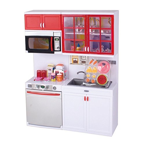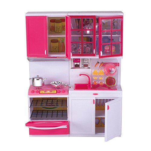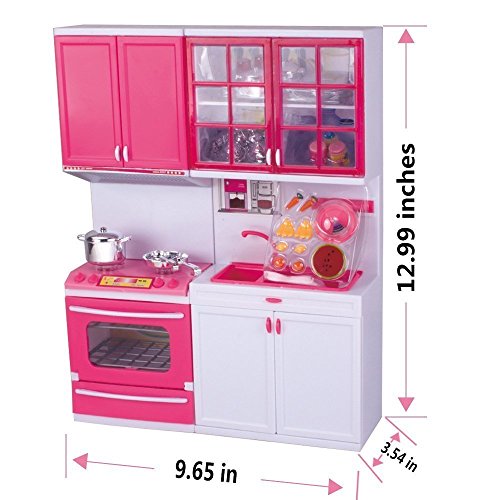 Package includes: 1 Set x Cabinet 1 Set x Stove JIESLINK Kitchen Playset with Light and Accessories is a great gift for the kids. This sturdy, brightly colored kitchen features realistic burners that light up and excite with realistic sound. Simply place the pot or pan onto a burner. The toy is one of the most realistic play kitchens your child will ever play with.Perfect for Use with 11-12" Tall Dolls