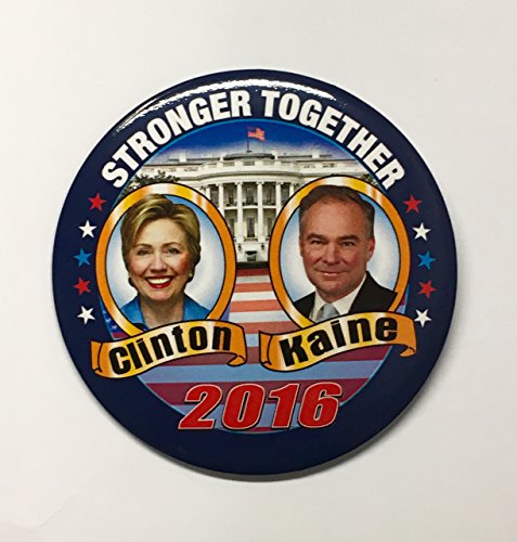 Hillary Clinton and Tim Kaine are the Democratic 2016 ticket. This 3 inch round laminated celluloid pinback campaign button is full of color. N.G. Slater has made collectible political buttons since 1936.