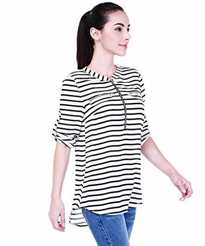 Coloroo Women's Roll Up Sleeve Zippert Front Stripe Blouse Team this effortless piece with skinny jeans. Size information(INCHES): SIZE: S Chest 36.6 Length 27.6 Sleeve 18.9 Waist 35.0 Hip 39.0 SIZE: M Chest 39.0 Length 28.3 Sleeve 19.7 Waist 37.4 Hip 41.3 SIZE: L Chest 41.3 Length 29.1 Sleeve 20.1 Waist 39.4 Hip 43.7 SIZE: XL Chest 44.5 Length 29.9 Sleeve 20.9 Waist 42.9 Hip 46.9 It is cut for a flattering loose shape and has a rolled cuffs at the sleeves that can be decided to be long or 3/4 sleeves by you. This relaxed piece is printed with floral motif, which is full of pastoral style to give you a more beautiful look and attract more attention.