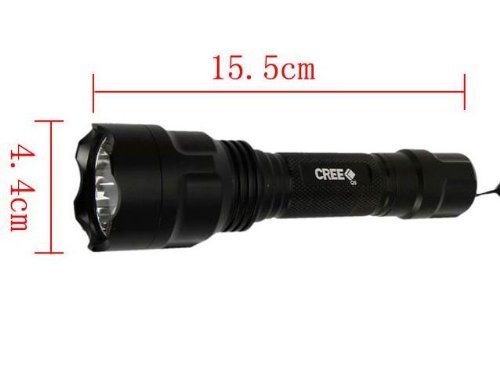 Specifications: C8 CREE XM-L T6 LED Flashlight Torch 1. Model: C8 2. Emitter Brand: CREE XM-L T6 LED 3. Light Color: White 4. LED: 1 5. Brightness: 1000 lumens maximum brightness 6. Battery Configurations: 1 x18650 3.7V OF 2x 16340 3.6V Battery(Batteries not included) 7. Input Voltage: 3.7, 8. Modes: 5 9. Runtime: About 2 hours 10. Lighting Distance: 200 m 11. Lightbulb/LED Lifespan: 100,000 hours 12. Material :Aluminum Alloy 13. Lens: Coated Glass Lens 14. Reflector: Aluminum Smooth/SMO Reflector 15. Switch Type: Clicky/Clickie 16. Switch Location: Tail-cap 17. Carrying Strap: Strap Included 18. Casing Color: Black 19. Size(mm):142mm(L) x 40mm(D) 20. Weight: 5.71oz /162g 21. Waterproof Design:Yes 22. Crenellated strike bezel for enhanced self-defense 23. Designed to mount on certain hand pistols, rifles and shotguns with proper mounting equipment 24. Also designed to mount on bicycle with proper mounting equipment Package Included: 1 x C8 Cree Xm-l LED T6 1 x 18650 Rechargeable Battery Charger(110v-240v) 1 x 18650 Rechargeable 3.7v battery