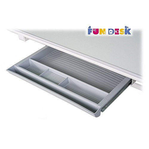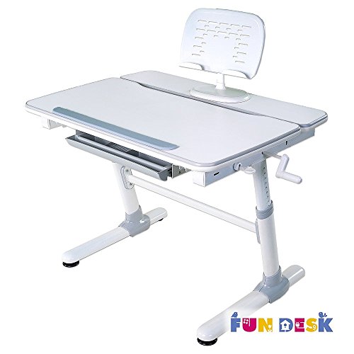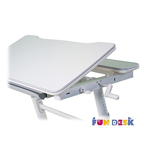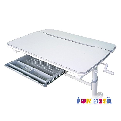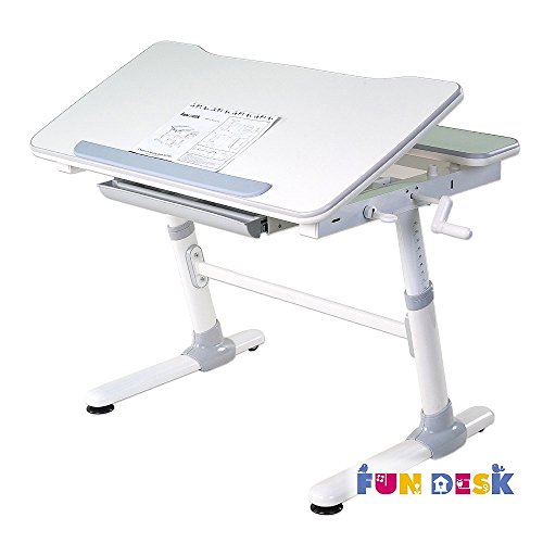 FunDesk's new ergonomic desk with enlarged work surface is designed to provides a more friendly and comfortable learning environment. With a crank handle, the height of the desk can be continuously adjusted according to your child's height. The desktop can be effortlessly tilted up to 25° and used for drawing, writing or reading. The compartmented drawer underneath desktop offers lots of space for books and stationery. Castor feet design is good for wood floor and easy to move.