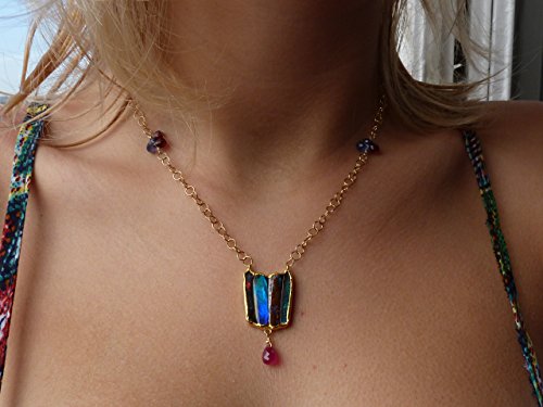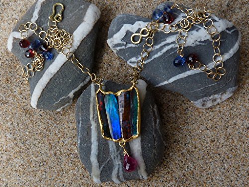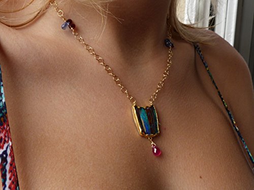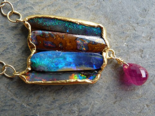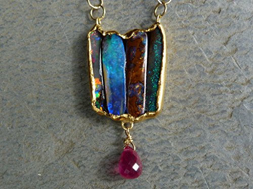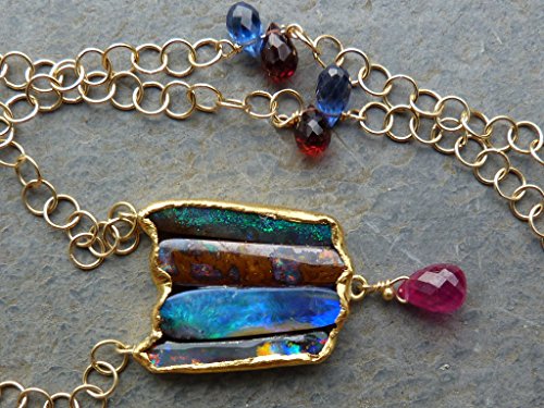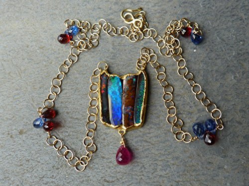 Necklace " Tulip " This necklace is a one of a kind. It is created and handmade by myself. It is done with a 18 kt yellow gold chain interrupted by cyanit and garnet briolettes.. In the center of the chains are hanging 4 in fin gold (24kt) setted australian boulder opals. The gold surface is hammered and not polished. Under the 4 opals is hanging a big ruby which has probably been heated. The weight of the australian boulder opals is: 11,15 ct The size and weight of the ruby is: 2 ct (8 mm x 5,2 mm). The gold weight is 8,16 grs The total length of the necklace is 43,5 cm, 17,4 inchs The size of the pendant part is 3,8 cm x 1,9 cm The necklace is signed and stamped.
