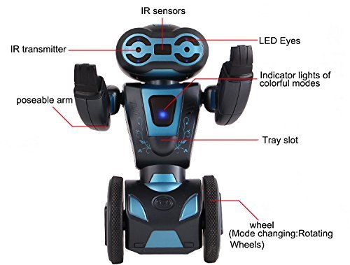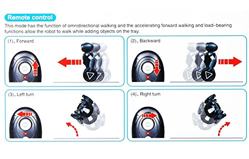 Features 2.4G automatic balancing RC stunt robot is a boy of any age or perfect children's toys. Its future looks 2.4G HG is a very special robot friend, has everything! 5 Operating Modes bring great fun to life: 1.Driving mode (pink signal light): under the remote control mode, as long as the players move the remote bar gently, it will follow the direction of the remote control to move. 2.Dancing mode (light green light): under the dancing mode, the robot will play music and dance on its own. 3.Boxing mode (red signal light): under the boxing mode, the RC robot can do boxing action and other kinds of actions by operating the remote control or allow two robots PK game. 4.Loading mode (dark green signal light): under the loading mode, the robot can be loaded with a tray. The robot's powerful balance ability make it easy to lift up goods lighter than its weight. 5.Gesture Control mode (blue signal light): under the gesture control mode, the robot will make a variety of corresponding action when your hand touch the induction part. Specification Size: 5.9" x 3.15" x 8.66" Transmitter: 2.4Ghz remote control Controllable Distance: > 65 Feet Power for Robot: 4 x 1.5V AAA (Not included) Power for Remote Control: 2 x 1.5V AA (Not included) Recommended Age: 8+ years old Package content 1x Self-balancing Smart Robot 1x Remote Control 1x Small Tray 1x User Manual Note 1. Batteries for robot and controller are not included. 2. The blue light of the eyes will flash and the light of the body will dark when the robot runs in low power.