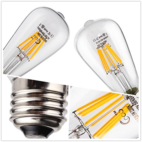 Description Cooo LED delivering innovation, quality and reliability with our LEDs and automotive lamps. Join Cooo LED world, you'll find another bright, colorful side in your life. Indoor and Outdoor, Must Decoration for Your Place. FEATURES 1.360° Omnidirectional beem angle with no dark area. 2.Soft warm white color temperature is safe to our eyes. 3.Green and eco-friendly contains no mercury or lead element.4.Vintage appearance bulb. 360°Omnidirectional Angle with no dark area. 5.Easy installation, medium screw E26 base, compatible with most lamp holder like pendant light,ceiling fan lamp. Specifications Product Type: 8W Dimmable Filament LED E26 Base 2200K LED Light Bulb Base Type: E26 Shape Type: Vintage Edison Style Working Voltage: AC 110V-130V Color Temperature: 2200K(Warm White, tend to a little yellow) Luminous Intensity:560LM Beam Angle: 360 Degrees Size:2.52*5.7IN Material: Metal and High-Strength Glass Light Source: COB-LED Long life last: 30,000 Hours 16 years life (5 hours per day) Authenticate Application: Home,Hotel,Garden,General Lighting,Office,Workplaces Warranty: New replacement or refund available within 1 year Package Included:8W*6 pack , 1*User ManualPlease do not hesitate to contact us if you have questions,we will respond within 24 hours.