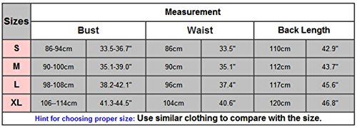 Sizes-----------------------Bust-------------------------------------Waist--------------------------------Back Length S------------------86-94cm/33.5-36.7''-------------------- 86cm/33.5''-------------------------110cm/42.9'' M------------------90-100cm/35.1-39''-------------------- 90cm/35.1''-------------------------112cm/43.7'' L------------------98-108cm/38.2-42.1''-------------------96cm/37.4''-------------------------117cm/45.6'' XL----------------106-114cm/41.3-44.5''-----------------104cm/40.6''------------------------120cm/46.8''
