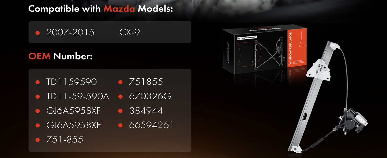 | Model | Power Window Regulator with Motor Compatible with Mazda CX-9 2007-2015 3.5L 3.7L Gas, Front Driver Side |