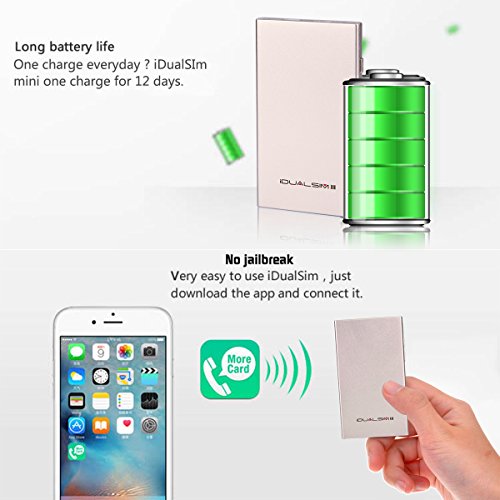 Note:1. The SIM card should support GSM network,or it will not be recognized by adapter2. Please feel free to contact us if you have any questions during your trying it Before using, kindly confirm below issues:1. Please access to the App Store to download and install the apps "Simplus" by your IOS device, then turn on Bluetooth in your phone2. Make sure your IOS device's Bluetooth standard is Blue 4.0. ( iPhone 4s and above ), and your device's IOS version is 7.1 and above3. You have access to Apple App Store, with internet connection GPRS, 3G, 4G and your Apple ID How to Use iDualSim Mini1. Take one sim card and insert into iDualSim. Sync contacting with your iPhone Long battery lifeDual sim card adapter can hold for 12days (288 hours) with only 2 hours charging Smart Dual Sim FunctionThe unread message and missed call will be sent to Simplus APP, if iDualSim mini has not connected with iPhone Cloud and User LoginLogin App: supports login with Facebook account, or you can resister a new accountAfter that, you should go to Cloud and binding device Anti-LostWhen your Apple product and iDualSim mini apart over 30ft, it will ring you to prevent you losing your own phoneYou can also use iDualSim mini to look for your phone, just like you wake your car in the parking lot,so that make sure you have one and only one phone on you at all time Remote Control CameraTake photos from any angles by pressing the camera button with iDualSim Mini Specification: Input: 5V 500maSize: 81*41*6mm N.W.: 30gG.W.: 175g Packing List:1*Dual card treasure 1*Micro-USB cable 1*SIM card sets 1* Manual