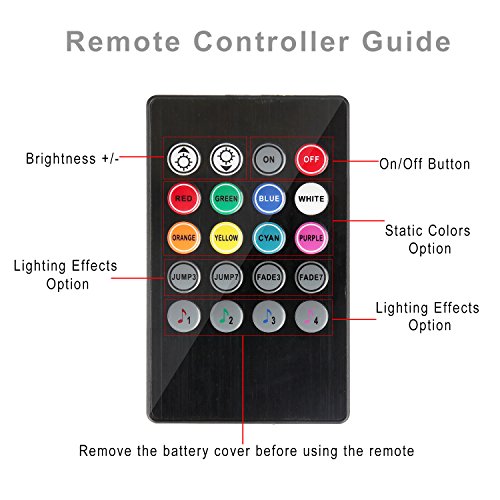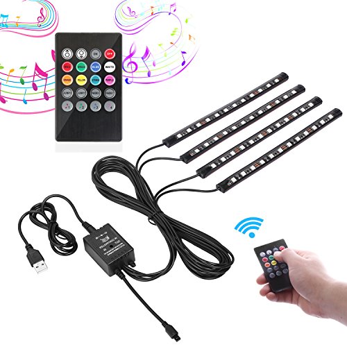 Features: 8 Monochrome Modes: Red, Green, Blue, White, Orange, Yellow, Cyan, Purple, and Brightness Control 4 Automatic Change Modes: 2 jump mode control, 2 fade mode control 4 Music Sensor Modes To make sure the remote control work, you need to point the control directly to the receiver Specification: Voltage: DC 5V Wattage: 10W Bulb Quantity: 4pcs 48 LEDs, 12 LED/ Light Light Color: RGB LED type: 5050 SMD Light strip size: 0.52inch x 0.36in x 8.67in 2 longer cables:200cm, 2 shorter cables:150cm Controller: 1.97 inch x 1.26 in x 0.91 in Car charger socket wiring: 19.7 in Our Promise: Guaiboshi is committed to providing the best service and product to each customer. If for any reason you are not satisfied, please give us a chance to improve your experience by contacting us through "Your Orders" tab in your Amazon account. We will try our best to solve your problems and our worry-free 180 days warranty.