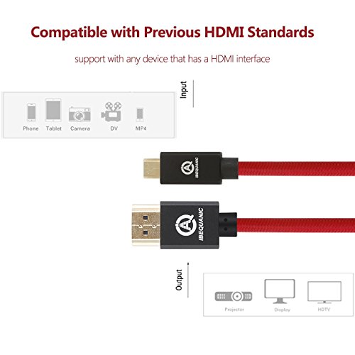 Descrciption Premium Micro HDMI Cable Support 18Gbps transfer speed with resolution up to 4K@50/60 (2160p), which is 4 times the clarity of 1080p/60 video resolution; Supports up to 32 audio channels and 1536kHz audio sample frequency for the highest audio fidelity while HDMI 1.4 supports up to 8 audio channels and 768kHz audio sample frequency; Premium Materials: Pure Copper Conductors, Triple Shielding and Gold-Plated Weldless Connectors for maximum performance and ultra low SNR Supports resolutions up to 4Kx2K (UHD) Category 2 Certified HDMI wire supports resolutions up to 4Kx2K (UHD) including 3840x2160, 2560x1600, 2560x1440, 1920x1200, and 1080p and supports Dolby True HD 7.1 audio and DTS-HD Master Audio Compatibility Devices: Blu-ray, DVD player, AV receiver, Apple TV, Roku streaming media player, Cable Box; Play Station 3/4, Xbox One/360, Nintendo Wii, or other HDMI compatible devices; Package Contents IBEQUANIC High Speed Micro HDMI Cable X1