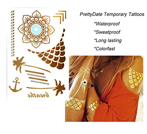 Our PrettyDate colorful metallic temporary tattoos are great for all ages: women, girls, kids and adults. Apply our waterproof tattoos anywhere on your skin, faces, necks, chest, arms, legs, you can become charming, stand out from all occasions-- birthday party, beach bonfire party, wedding, festivals feast. Take them, like a princess, show your charming look. Features Non-toxic and safe Waterproof and durable Easy to apply and remove without any effort Various colors and patterns for your choice Decent Quantity: 6 sheets in one delicate bag Easy to apply Step1:Clean and dry skin completely Step2:Cut off the design you like with a scissor, remove clear film Step3:Place the face of tattoos down on skin Step4:Rub the back of tattoos with a damp cloth or sponge for 10-20 seconds Step5:Gently lift corner of tattoos to check if it is fully transferred. If it is, gently peel off paper. If not, press down again and wet again Note: If treated carefully, avoid rubbing, your PrettyDate Temporary Tattoos can last for several days after applying How to remove Apply baby oil or rubbing alcohol, face cream or olive oil, rubbing gently into the tattoo until fully removed.