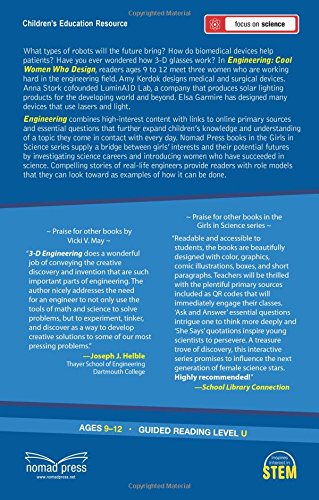 What types of robots will the future bring? How do biomedical devices help patients? Have you ever wondered how your phone works? In Engineering: Cool Women Who Design, readers ages 9 to 12 meet three women who are working hard in the engineering field. Elsa Garmire has designed many devices that use lasers and light. Amy Kerdok designs medical and surgical devices. Anna Stork co-founded LuminAID Lab, a company that produces solar lighting products for the developing world and beyond. Engineering combines high-interest content with links to online primary sources and essential questions that further expand kids' knowledge and understanding of a topic they come in contact with every day. Nomad Press books in the Girls in Science series supply a bridge between girls' interests and their potential futures by investigating science careers and introducing women who have succeeded in science. Compelling stories of real-life engineers provide readers with role models that they can look toward as examples of how it can be done.