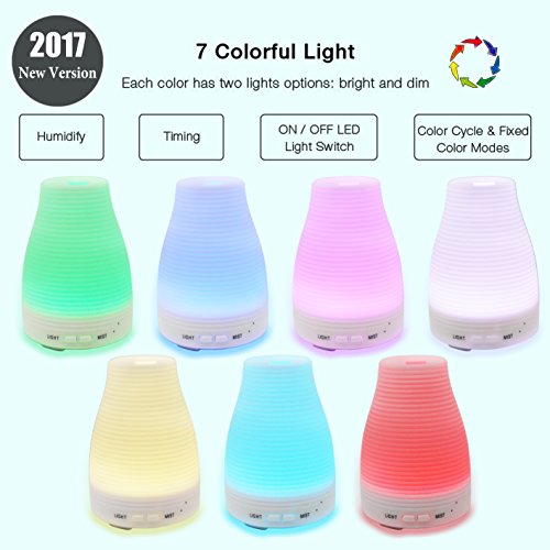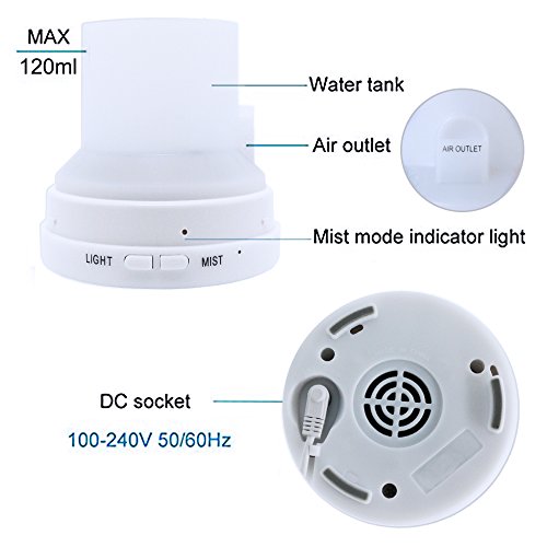 Description: Pure white coating with aroma diffuser ultrasonic humidifier air purifier. Designed as an integrated and portable product with a nice shape and unique style: gorgeous piece for people enjoy life. Simple Operation: In accordance with user-friendly principle, this essential oil diffuser is easily to use, no complex operation. The following steps are presented as blow: 1. Place this product on a horizontal platform; 2. Lift up the cap of the humidifier, and fill the water tank with purified water; 3. Add drops of aromatherapy /essential oil into the water tank; 4. Connect the humidifier to power source and press "MIST" to turn it on/off. 5. You can press "LIGHT" to change the color of LED light or steady color of LED light. 6. When the water is run out, the unit will automatically power off along with a "beep" sound. Specifications: Water Capacity: 120 ml Product Dimensions: 100*100*140 mm / 3.9*3.9*5.5 in Product Weight: 200 g / 7 oz Advanced Ultrasonic Technology: 2.4MHZ Working time: up to 6 hours Input power: AC100-240V 50/60HZ Output power: DC 24V 650MA Support Lack Water Protection: YES LED Light: 3 Bulbs Support Light Color Changing/Dynamic Color: YES Support Freeze/Fix Light Color: YES Includes: 1x Ultrasonic Humidifier1x AC Adapter 1x Measuring Jug Note: The accessories are in the water tank of the product, please open the tank cover to get the accessories.★ We will be responsible for it if there is any quality problem. We provide full refunds & returns if there's any problem after receiving the product.★ So if you find any problem or have any question, please feel freely to contact us.