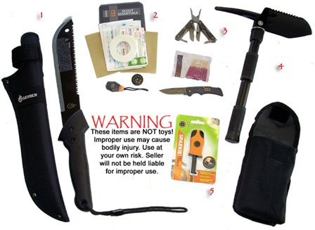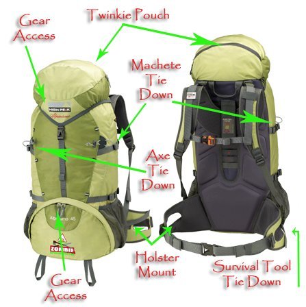 The Alpinizmo 45 is a light weight climbing backpack made of 330d doddy and high velocity nylon and is the foundation of this 45 liter Zombie Apocalypse Pak (ZAP). It has a variable setting quick adjust back-panel. There are 2 side compression straps as well as bungee ice axe holders. Internally, there is a hydration bladder envelope and a zippered shelf separating the 2 compartments. Your tent is built into the bottom compartment and is so compact that when stowed you can still put a compressible sleeping bag in with it. This tent-backpack combination weighs just 6 lbs. The built in 2 person ultra light sil-nylon single wall backpacking tent keeps the Alpinizmo 45 ZAP light and mobile. The tent is an ultra light, fully enclosed, single wall tarp tent designed with No See Um mesh base vent panels, a seam sealed nylon bath tub floor, and sil-nylon walls with a single front door. The body of the tent is held up by 4 corner stakes, 2 exterior guy lines and 3 poles. 2 poles form an "A" frame doorway and the back pole, that can be set inside or outside, holds up the rear. Inside there are 2 gear pockets set to each side of the entry. It is extremely quick to setup even while connected to the back pack. It also strikes and stows quickly when you've got to move on.