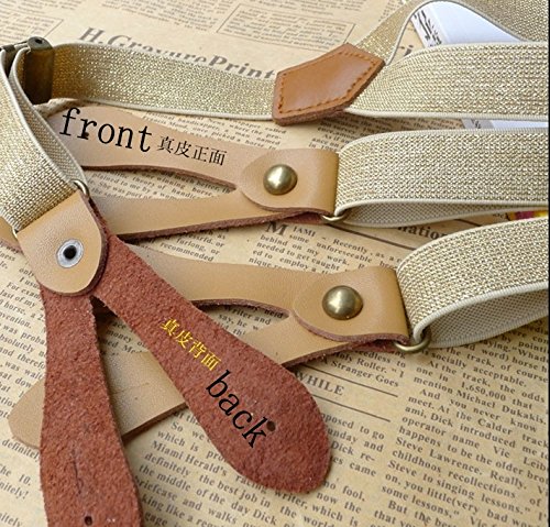 Color:show as picture. There are glitter on the suspenders NOTE:Slight color aberrations may exist because the different screen settings,hope you can understand. elastic leather and adjustable to your measures 6 buttons and 3 length adjusters add durability Attention please:it not fit for big adult(taller than 70"/178cm)
