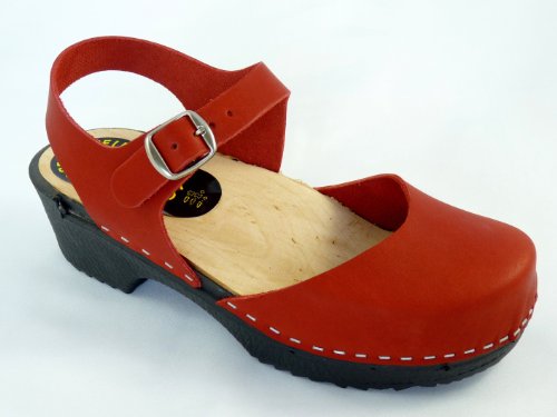 Super comfortable pair of Mary Jane Style Soft Soled Clogs in Red wax leather with anatomically shaped bare wooden insole. These clogs have been developed by Torpatoffeln whose family have been making clogs since 1860. These feature an anatomically shaped wooden footbed which provides support and grip for the soles of your foot whilst the untreated wood lets the sole of your foot breathe. This is encased in a polyurethane rubber material which acts as a shock absorber for your feet. The result is a fabulously comfy shoe/clog and ideal for people who spend a lot of time on their feet. These clogs fit to size so order your regular size.
