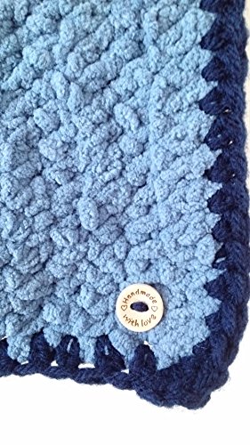 Item: Crocheted Blanket Colour: Blue trimmed in Navy Size: Length 46 cm (18 inches); Width 41 cm 16 inches). We have for sale this beautiful hand crocheted baby blanket. It is made from Chenille fleece chunky type wool, in a self coloured stripe or dot effect design with a pretty crocheted border. The top of the blanket is turned over and fastened down with two wooden buttons fastened with matching ribbons. These can be removed easily if preferred. This blanket feels as soft as a cloud but has a really chunky feel. It will keep baby snug at night or out in their buggy or car seat.