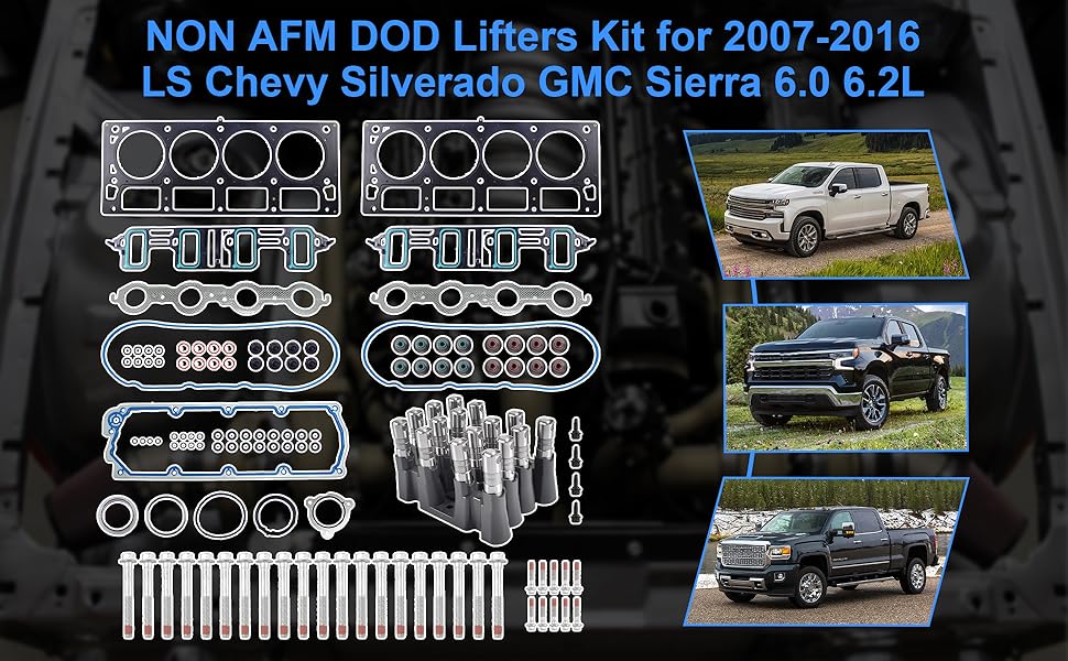 The NON AFM DOD Lifters Kit is designed for 2007-2016 LS Chevy Silverado, GMC Sierra, and Yukon models, featuring a complete head gasket set, 30 cylinder head bolts, and 16 non-AFM hydraulic roller lifters. This kit ensures optimal engine performance and longevity, backed by a 12-month warranty.