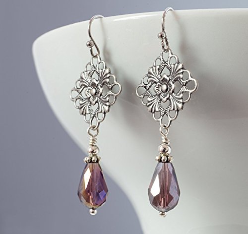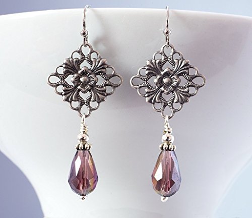 Elegant Edwardian/Tudor style earrings with antique silver filigree connector in the form of the Tudor rose, bead caps, and silver plated ear wires, gracefully show against the stunning colours of a rose crystal pear drop bottom bead. Hand crafted in our Welsh studio, these gorgeous earrings with there amazing light reflection will look great with any dress occasion. Each earring has a 50mm (2") drop. Ready for shipping. I take great care wrapping all jewellery in fine soft tissue paper, placed within an organza gift pouch, then packed in a mailing box for extra protection whilst in transit. Thank you for looking