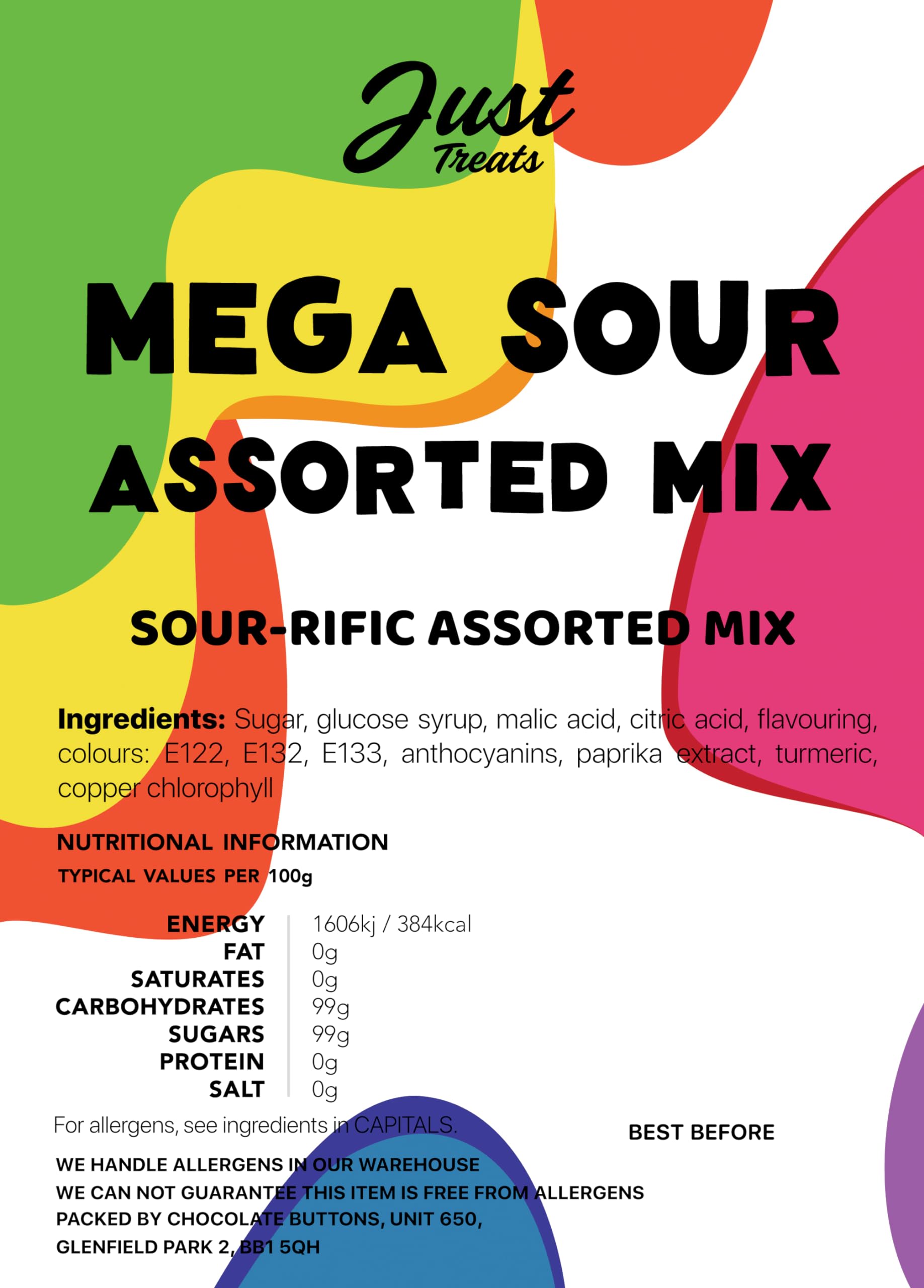 Just Treats Mega Sour Assorted Mix offers 1kg of intensely sour boiled sweets with a fruity center, sealed for freshness and crafted in Lancashire to ensure premium quality and authentic taste.