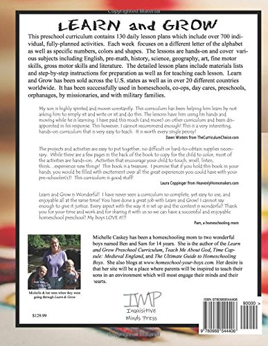 Throw away those dry, boring workbooks! Children learn so much more effectively when all of their senses are engaged. If you want to help your children develop a love for learning rather than quenching any desire that they have in that area then Learn and Grow is the right choice for you. Learn and Grow is no ordinary preschool curriculum. Learn and Grow: Hands-On Lessons for Active Preschoolers is unique in that it is packed with hands-on learning for your preschooler, ages 2 - 4. It is easy to follow, even for the non-experienced teacher. Each lesson contains a materials list as well as detailed step-by-step instructions for each lesson and for any preparation that is necessary. No longer are hours of prep work necessary for teaching your child. Gone are the days of walking endlessly around teacher supply stores looking for obscure but necessary materials. Simply pick up the Learn & Grow curriculum, gather a few common household items, and you are ready to begin. Many parents opt to send their child off to preschool, paying hundreds of dollars a week for their child to learn. That is not necessary! Using Learn & Grow is a great way to save money. Unique features of Learn and Grow are the following: 130 daily lesson plans 26 weeks worth of lessons if done 5 days a week - 43 weeks worth if done 3 days a week - 65 weeks worth if done 2 days a week Over 700 individual, fully-planned activities which will engage all of your child's senses Includes English, pre-math, history, science, geography, art, fine motor skills, gross motor skills, and literature Detailed lesson plans for each activity, including materials lists and step-by-step instructions for preparation as well as the steps necessary for teaching each lesson Developed by a homeschool mom and Sunday School teacher with over 15 years of experience Most materials are easily found around the home or are simple to purchase - making teacher preparation quick and painless Includes access to a full-color companion do