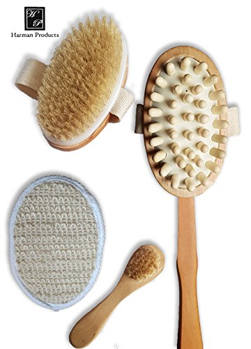 The skin is the largest organ of the body, therefore it's essential you look after it. This brush set will allow you to do just that. The premium boar bristles work by removing dead skin cell toxins your body produces and will make it healthier and more vibrant. It also stimulates the lymphatic system and optimises circulation. The face brush reaches the pores and mildly exfoliates the skin making it look much younger. Both brushes can be used in the shower and for dry brushing. The massager is easy to use and feels great on the skin and can increase your well-being and reduce cellulite. Both the brush and massager include a hand strap to make the massaging/exfoliating process easier than ever before. Body brush and massager The purpose of the body brush is to eradicate dry skin on your body and the boar bristles do a brilliant job. The boar bristles are long lasting and are of excellent quality. The body massager makes your muscles feel less fatigued and will get rid of cellulite by increasing the circulation. Face Brush We understand that your facial skin is much more delicate which is why we ensured the face brush has finer boar bristles to prevent damaging the skin. However, they are still effective in eradicating dry skin on the face. Extendable Handle The extendable handle was included to make the experience much easier- you can now reach areas you couldn't before, such as your back with ease. Loofah Our Loofah is designed to be comfortable to hold and use. The sisal hemp and Terry Cloth Materials are soothing yet effective on the skin. This product will ensure your skin is free of dry skin. Harman Products regard customers as their top priority and all we want is for you to have an excellent experience with our products and to get brilliant value for money.